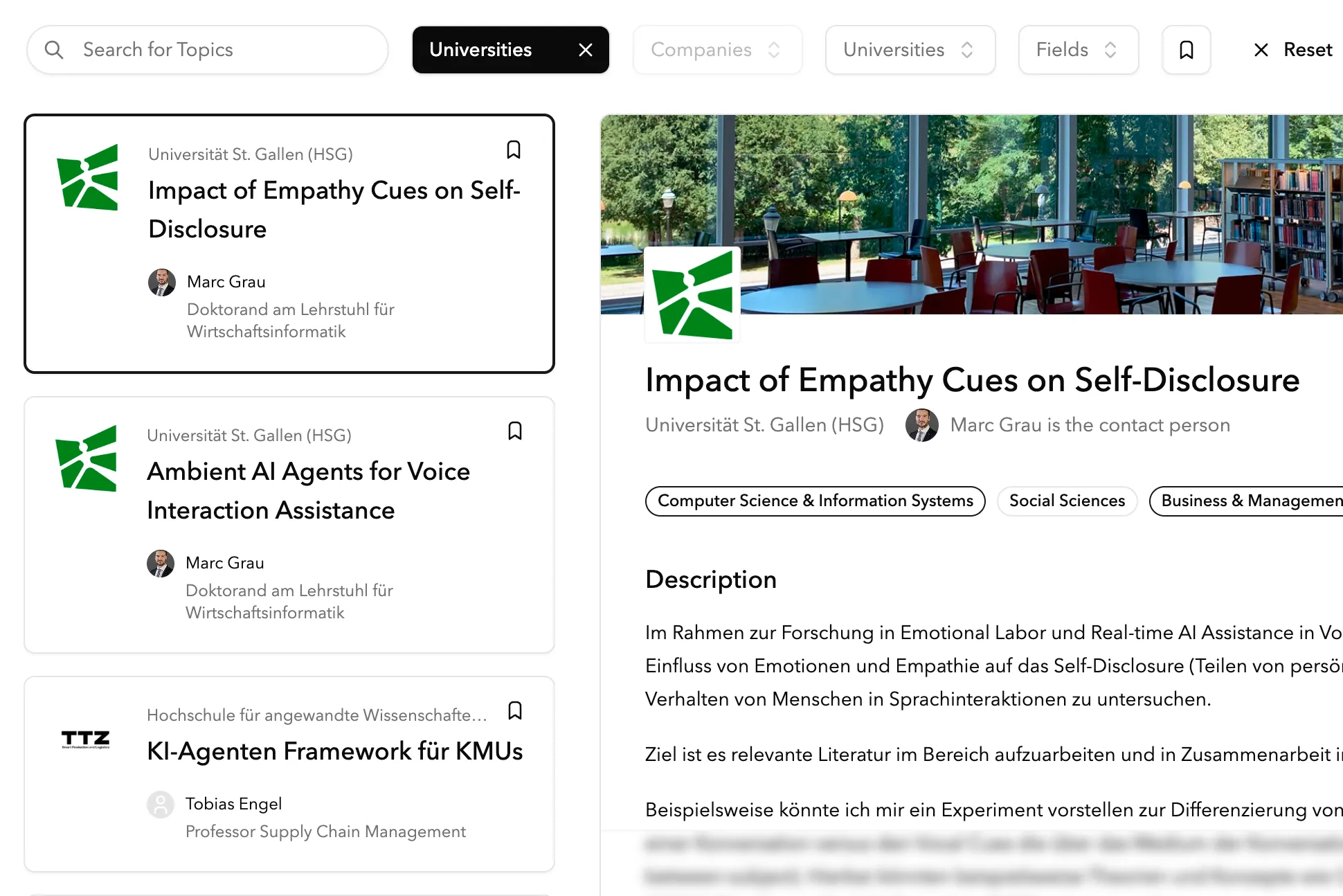 One platform connects your students, researchers, and programs with 185+ companies across Switzerland. No fragmented tools, no manual coordination. Students discover topics, researchers find partners, and your institution gains visibility - all in one place.